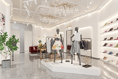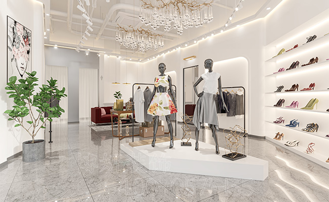 这是一家精美女装店装修设计效果图。整体的装修手法非常的时尚大气感十足。女装店的中心放置着模特,将店内的当季主打特色衣服展现出来,旁边将整面墙面都设置成鞋柜,完美的展示出店内的精品。女装店内部还放置一个沙发,专供顾客休息。