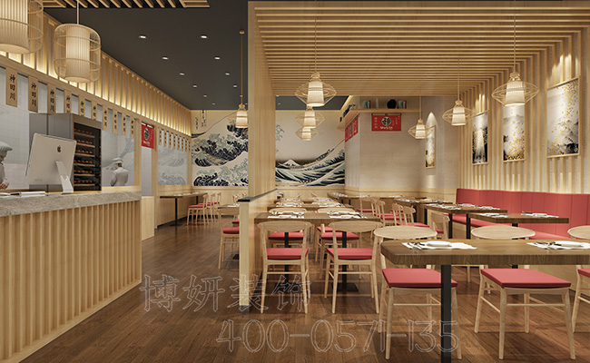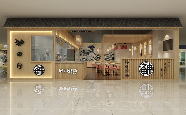 这是一家日式面馆装修设计效果图,整体的装修设计非常的简约时尚。从面馆的门头来看整体非常具有创意,从外面看起来像一座房子,给人非常具有记忆点。将店的招牌也是深刻的设计在旁边,整体用心装修。